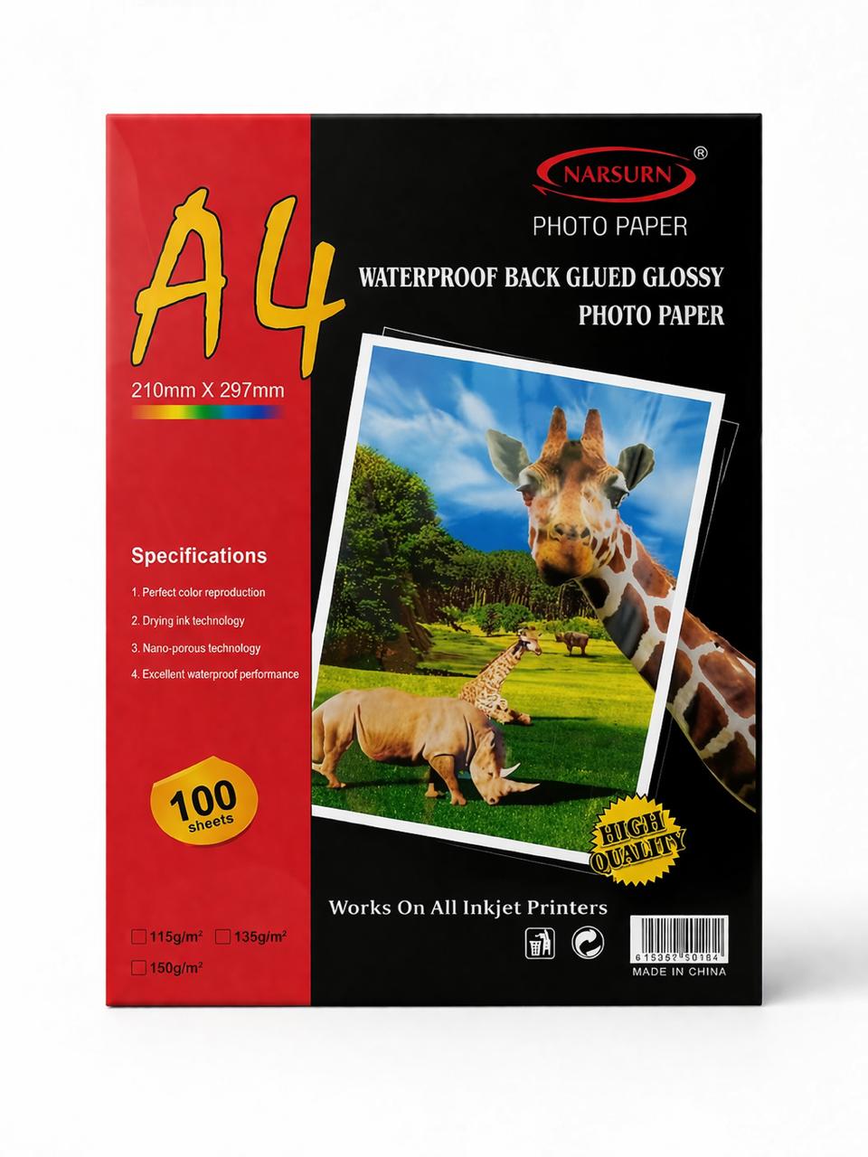 Papier photo brillant –  Format : A4- Grammage : 135 g- Finition : Brillante- Autocollant : Oui- Conditionnement : Paquet de 100 feuilles- Idéal pour impressions photo, étiquettes et créations personnalisées