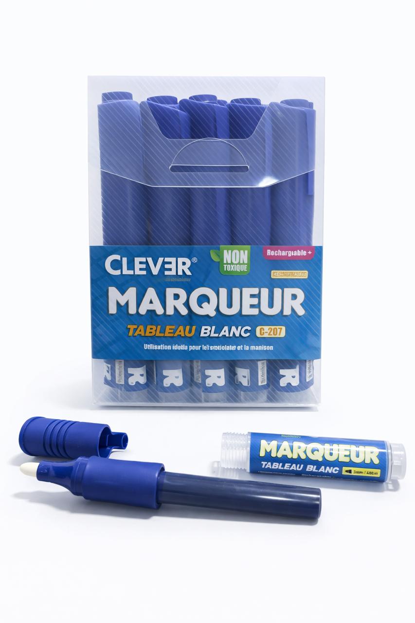 Marqueur Rechargeable 12P CLEVER C-201 – 400M- Effaçable – Pour tableau blanc – Séchage rapide, odeur neutre – Couleur : BLEU