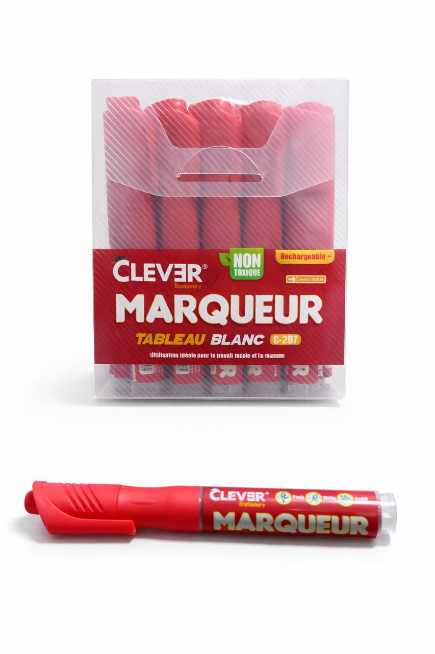 Marqueur Rechargeable 12P CLEVER C-201 – 400M- Effaçable – Pour tableau blanc – Séchage rapide, odeur neutre – Couleur : ROUGE